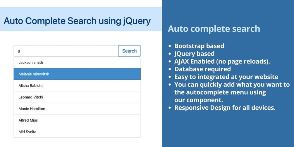 The Bootstrap autocomplete component predicts entered words based on the first letters given by the user. You can search the list using basic scrolling and keyboard arrows.